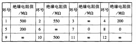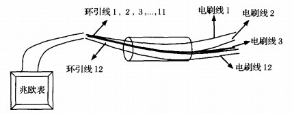絕緣電阻檢測絕緣電阻是指在一定的電壓下各環(huán)路之間的絕緣電阻??捎?00V或250V兆歐表檢測。圖3為絕緣電阻檢測示意圖,將被測12路滑環(huán)的電刷線隔離放置,環(huán)引線(被測環(huán)路引線除外)并聯(lián)焊接一處。其中被測環(huán)路的環(huán)引線為一檢測端,其余并聯(lián)的環(huán)引線為另一檢測端,用500V或250V兆歐表測得當(dāng)前電阻值。