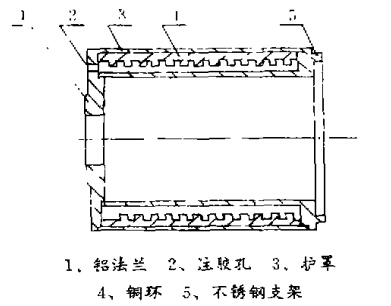電滑環(huán)是我司的主要產(chǎn)品,所用環(huán)氧膠的配方就直接涉及其零件之一滑環(huán)(其結(jié)構(gòu)如圖1所示)的灌腔質(zhì)量,由于我們所一直延用過去的配方,在機(jī)械加工時,常出現(xiàn)粘接強(qiáng)度不夠,被刀具擠裂,以及出現(xiàn)氣泡、裂紋等現(xiàn)象,為了解決這個問題,我們通過改變環(huán)氧樹脂膠粘劑配方、灌膠工藝等措施,來提高環(huán)氧樹脂性能和滑環(huán)的穩(wěn)定性。下面就這個問題局部進(jìn)行探討。
