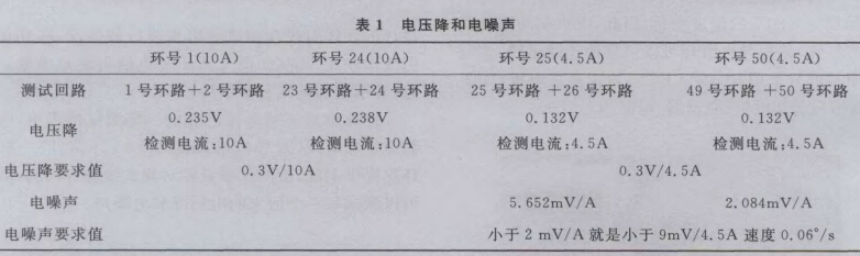 在電機(jī)驅(qū)動(dòng)電滑環(huán)的過程中,為了防止電滑環(huán)的環(huán)體引線在測試時(shí)出現(xiàn)纏繞的情況,將環(huán)體引線串聯(lián)在一起,電刷引線也串聯(lián)一起,并引出加電線和測試線。在電滑環(huán)的電噪聲和電壓降測試過程中,電源通過加電線,對(duì)電滑環(huán)的1-24環(huán)路,25-50環(huán)路提供電源,檢測儀器只要對(duì)測試線進(jìn)行檢測,就可以測試每一個(gè)回來的電壓降和電噪聲。