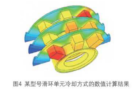 同時(shí),對(duì)該型號(hào)電滑環(huán)采用數(shù)值計(jì)算的方法進(jìn)行分析,之后可以將計(jì)算結(jié)果與測(cè)試結(jié)果進(jìn)行比對(duì),通過這種計(jì)算與實(shí)驗(yàn)相結(jié)合的方法來分析其冷卻系統(tǒng)的性能。溫度分布的數(shù)值計(jì)算結(jié)果如圖4所示。