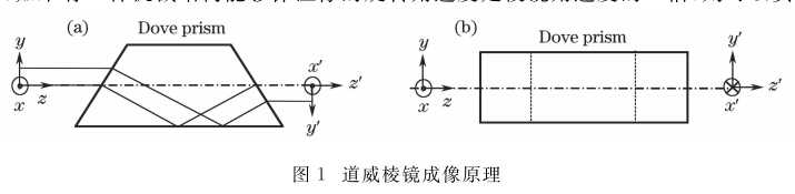 道威棱鏡是一種去掉頂端多余部分的直角棱鏡,當(dāng)光線從棱鏡的一端以平行棱鏡底面的方向平行入射時(shí),經(jīng)過兩次折射和一次反射后以同樣的方向平行射出。 圖1是道威棱鏡成像的原理。 在圖1(a)中,物體經(jīng)過道威棱鏡后,成的像是上下顛倒(即狔 方向發(fā)生改變);當(dāng)棱鏡繞光軸旋轉(zhuǎn)90°后,成的像左右顛倒(即狓方向發(fā)生改變),如圖1(b)所示。 也就是說,當(dāng)棱鏡繞光軸旋轉(zhuǎn)90°時(shí),成的像也繞光軸旋轉(zhuǎn),而且旋轉(zhuǎn)角度為180°。 所以,如果有一種機(jī)械結(jié)構(gòu)能夠保證像的旋轉(zhuǎn)角速度是棱鏡角速度的2倍,則可以實(shí)現(xiàn)消旋。
