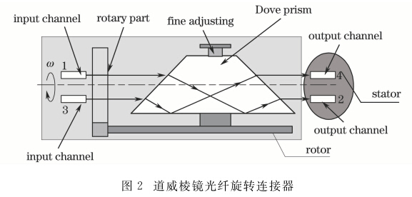 在圖2中,假如入射端光線(如1和3)以角速度ω 繞轉(zhuǎn)動(dòng)軸旋轉(zhuǎn),同時(shí)道威棱鏡以ω/2角速度轉(zhuǎn)動(dòng)時(shí),出射光線(如2和4)的位置保持不變。 當(dāng)該系統(tǒng)用于圖像傳輸時(shí),在棱鏡的特征方向上,出射方向上的像是入射方向上像的倒像,即以右手坐標(biāo)入射的光,在出射端變?yōu)樽笫肿鴺?biāo)系。